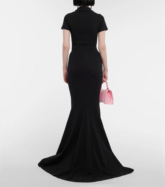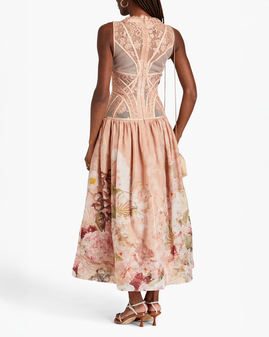 Vestido largo de gasa, point d'esprit y encaje en mezcla de lino y seda con estampado floral